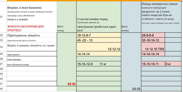Всі матеріали відправляю з відеоінструкцією, таблиці та текстові файли, електронний щоденник, де потрібно заповнювати свої результати. І я їх бачитиму записи, щоб відстежувати процес. У програмі докладно розписані вправи, відпочинок, підходи, повторення, відео/фото техніки виконання та все необхідне для прогресу.